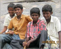 இயற்கை தரும் பரிசுத்த நீர் எங்களுக்குள் ஆத்மாவை நிரப்புவதுபோல் இறங்கியது. மற்ற பாட்டில்களை நிரப்பிக்கொண்டு மீண்டும் இறங்கினோம். ஏறும்போது கவட்டை மாதிரி பிரிந்ததே, அந்த இடத்திற்குச் சென்று சேர்ந்துவிட்டோம். சிறுசிறு கற்களால் குவித்துச் செய்த பிரமிடு அப்படியே அங்கிருந்தது. அதைத் தாண்டி நடக்க இரண்டாவது அத்தியாயத்தில் நம்மைக் கடந்து சென்ற ஆடுகளெல்லாம் பெரிய பாறையொன்றின் மீது ஓய்வெடுத்துக் கொண்டிருந்தன. தலைமையாடு ஒன்று - தாடிக்கார ஆடு - எழுந்துவந்து பாறை விளிம்பில் நின்று எங்களை முறைத்துப் பார்த்தது. "எங்கள் ஏரியாவுக்கு வராதே!" என்று சொல்லும் பார்வை அது. அவற்றைத் தாண்டி நீரோடிய பரந்த பாறைப் பரப்புக்கு வந்தோம். மரம்வெட்டும் சிறுவர்கள் அரிவாட்களோடு உட்கார்ந்து அரட்டையடித்துக் கொண்டிருந்தார்கள். எங்களைப் பார்த்ததும் அரட்டையை நிறுத்திவிட்டுச் சிரிப்பை அடக்கக் கஷ்டப்பட்டார்கள். "போட்டோ எடுங்கண்ணே" என்றான் ஒருவன். எடுத்து கேமராவின் எல்ஸிடி திரையில் காட்டினோம். இன்னும் சிரித்தார்கள். "ஸ்கூலுக்குப் போலயா?" என்று பசு கேட்டான். "இன்னிக்கு லீவுண்ணே. சுள்ளி பொறுக்க வந்தோம். போட்டோ அனுப்புறீங்களாண்ணே?". அனுப்புகிறோம் என்று சொல்லிவிட்டுக் கிளம்பிக் கொஞ்சதூரம் வந்ததும்தான் முகவரி வாங்காமல் வந்தது உறைத்தது. திரும்பச் செல்லத் தெம்பு யாருக்கும் இல்லை! அடுத்ததடவை பசு திரும்ப கொல்லிமலை ஏறும்போது அச்சிறுவர்களைப் பார்க்க நேர்ந்தால் கட்டாயம் முகவரி வாங்கச் சொல்லவேண்டும். ஒருவேளை அச்சிறுவர்கள் சற்று பெரியவர்களானதும் இணையத்தொடர்பு கிடைத்து கூகுளாண்டவர் அருளால் இந்தப் படங்களைப் பார்க்கலாம்.