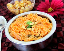 செய்முறை அரிசியைக் கழுவி 2 கிண்ணம் தண்ணீரில் 30 நிமிடம் ஊறவைக்கவும். குக்கரில் எண்ணெயைக் காய வைத்து, பச்சை மிளகாய், லவங்கம், பட்டை, சோம்பு சேர்த்து 2 நிமிடம் வதக்கவும். பிறகு வெங்காயம் சேர்த்துப் பொன்னிறமாக மாறியதும் தக்காளி பேஸ்ட், இஞ்சி பூண்டு விழுது, புதினா, கொத்துமல்லி சேர்த்து பச்சை வாசனை போக வதக்கவும். ஊறவைத்த அரிசி (தண்ணீருடன்) போட்டு, உப்பு கலந்து மூடவும். இரண்டு விசில் வந்ததும் இறக்கவும். |